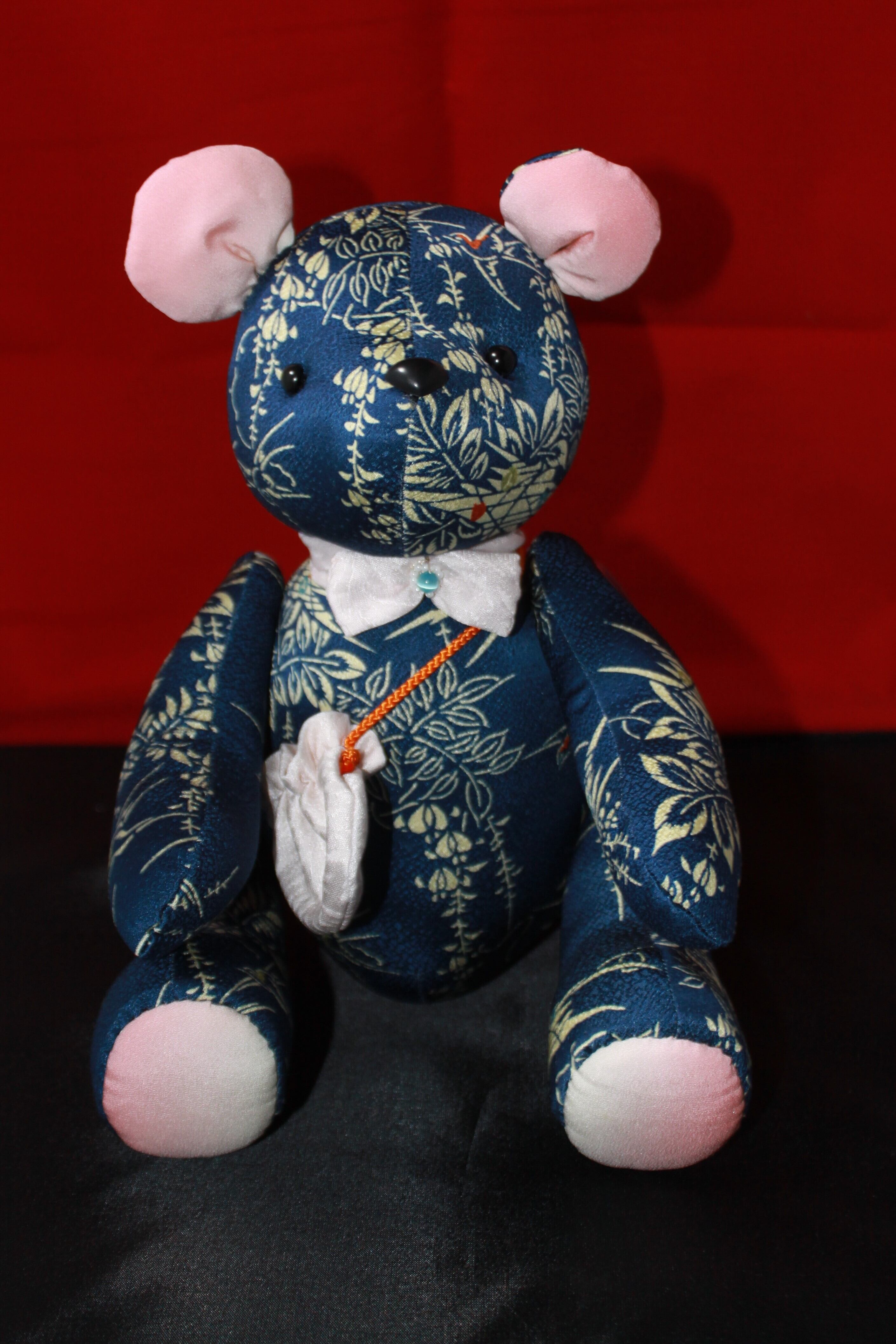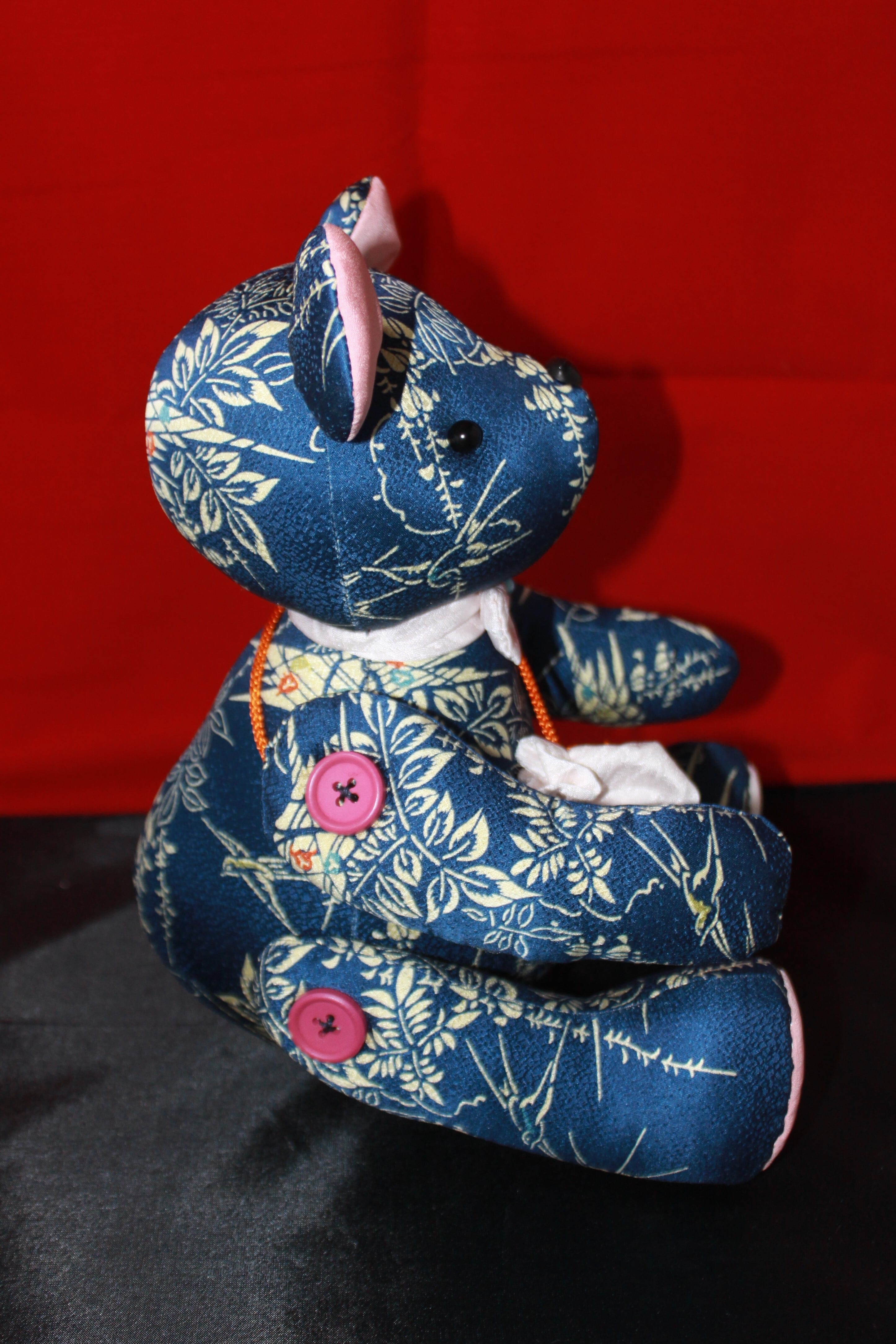 このテディベアは、細部まで手作業で作り上げられており、一つ一つに職人の思いが込められています。正絹の着物地を再利用して作られているため、持つ人にも自然のやさしさと美しさを感じさせます。