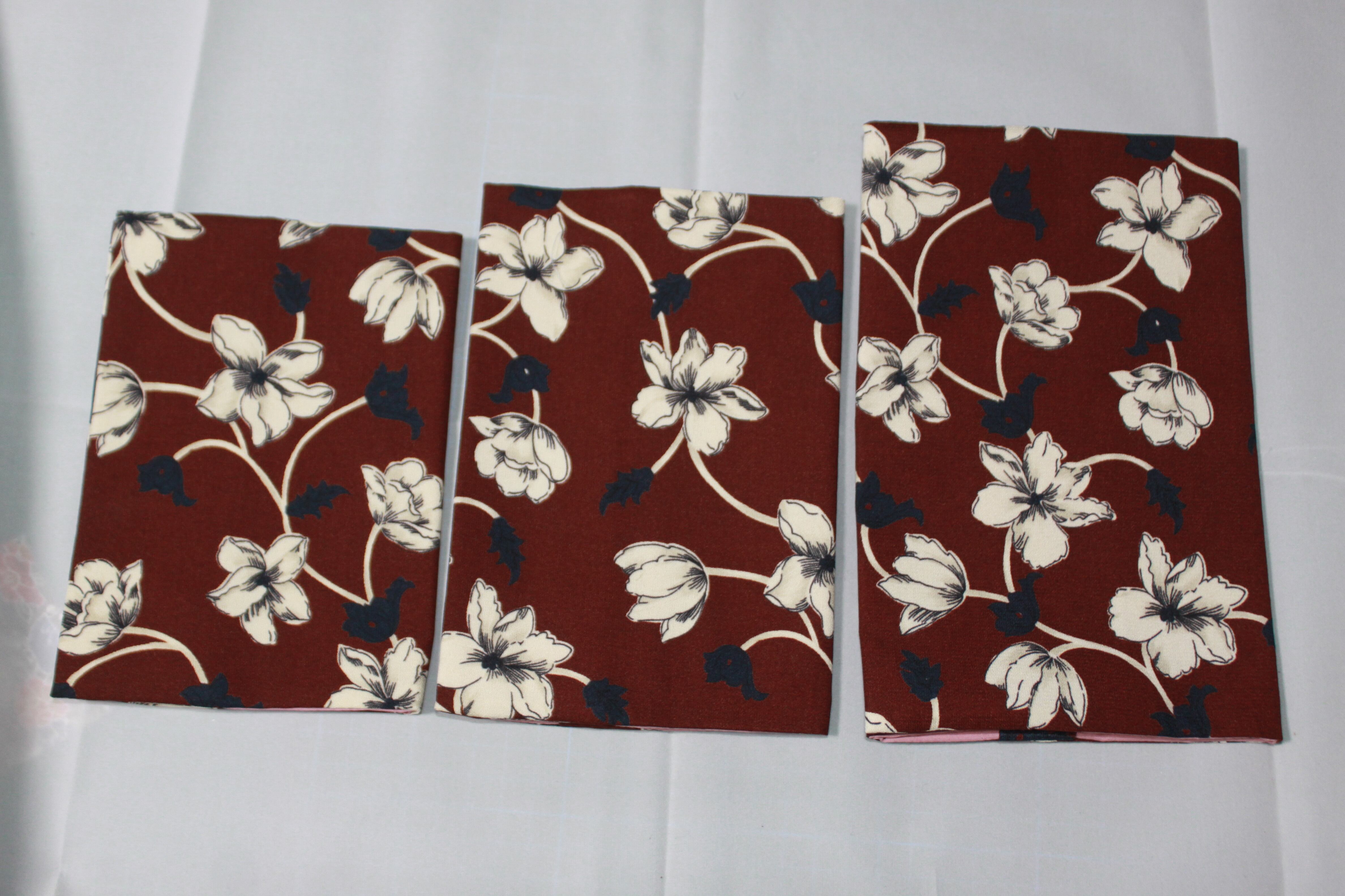 シックな花柄のプリント生地が素敵なブックカバー三点セットです。臙脂(えんじ)色の落ち着いた雰囲気と、花柄の甘さが絶妙に調和したデザインが魅力です。セットには文庫本、新書、四六判の3タイプがあり、異なるサイズの本にも対応できます。裏地もしっかりとついているので、本の表紙を保護するだけでなく、長くご愛用いただけます。